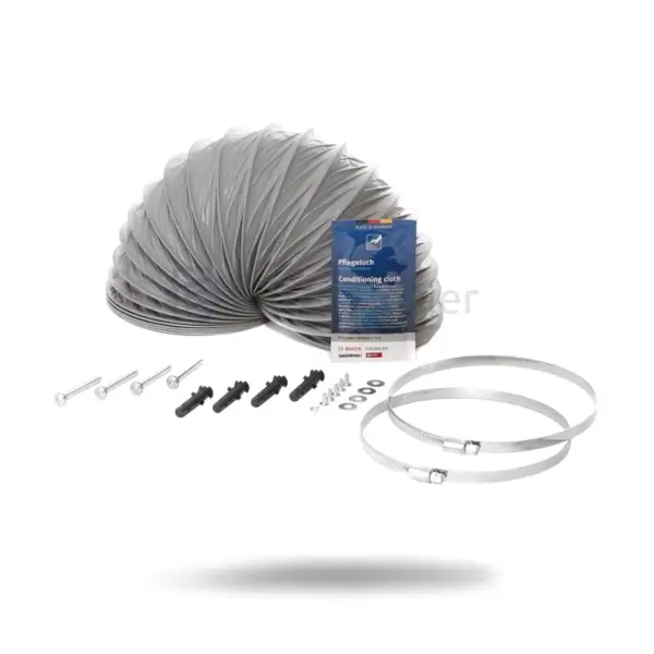 Bestehend aus Filtergehäuse mit Designdeckel, mehrfach regenerierbarem Long Life Aktivkohlefilter, flexiblem Schlauch, 2 Schlauchschellen und Montagematerial
